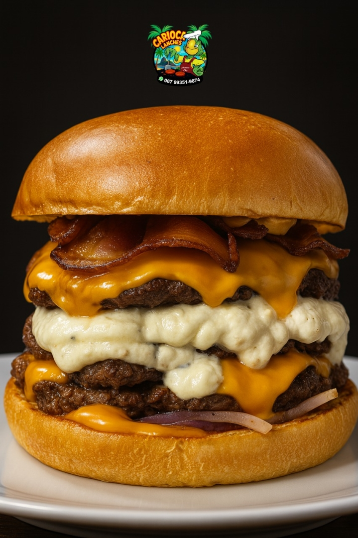 Pão de brioche artesanal, 3 hambúrgueres bovino de 100g ,molho american, bacon, cebola roxa, creme cream chesse, 4 fatias de cheddar.