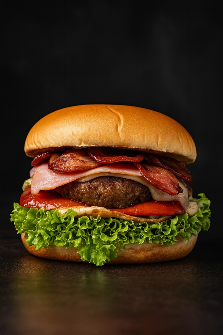Pão, maionese, hambúrguer bovino de 100g, calabresa, salsicha, ovo, presunto, mussarela, alface e tomate.