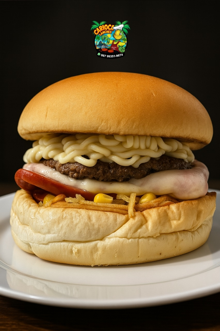 Pão, maionese caseira, hambúrguer bovino de 100g, salsicha, ovo, cebola roxa,batata palha, presunto e mussarela