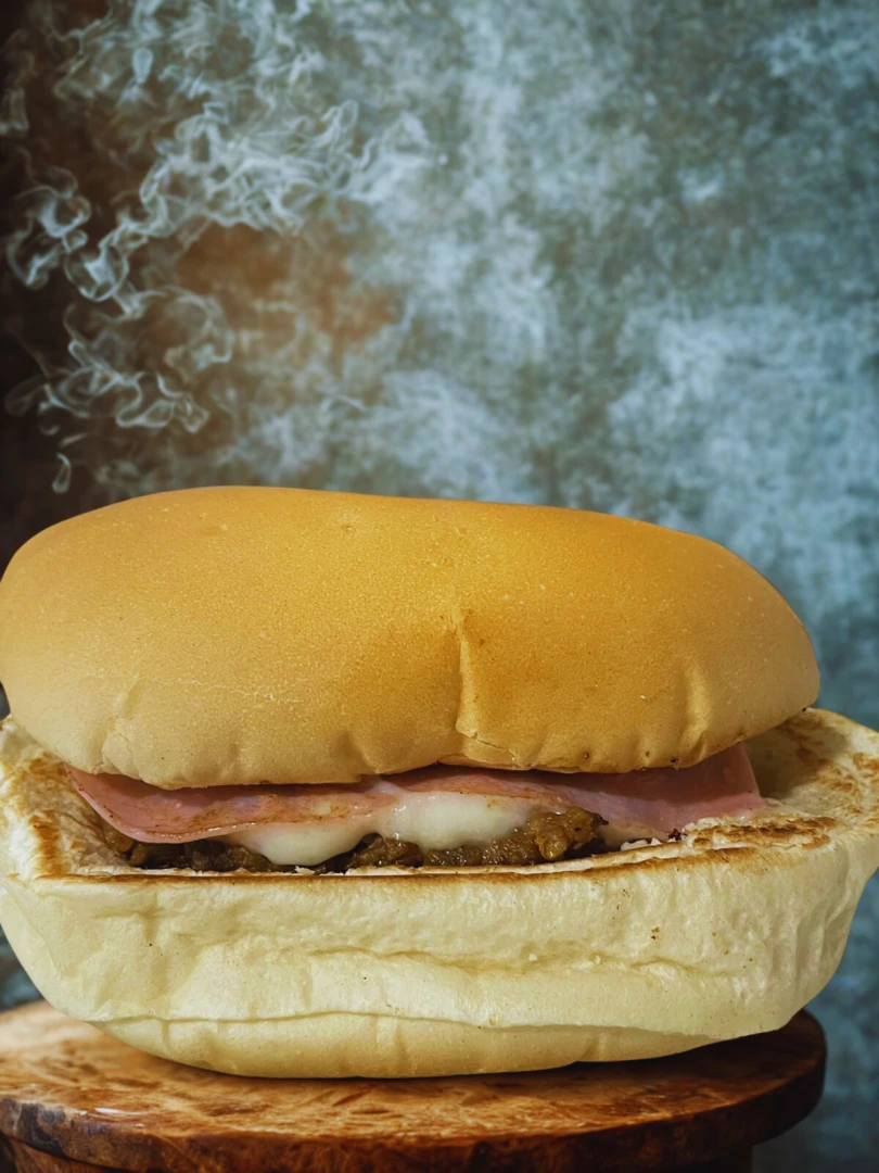 Pão, maionese, hambúrguer bovino de 100g, presunto e mussarela.