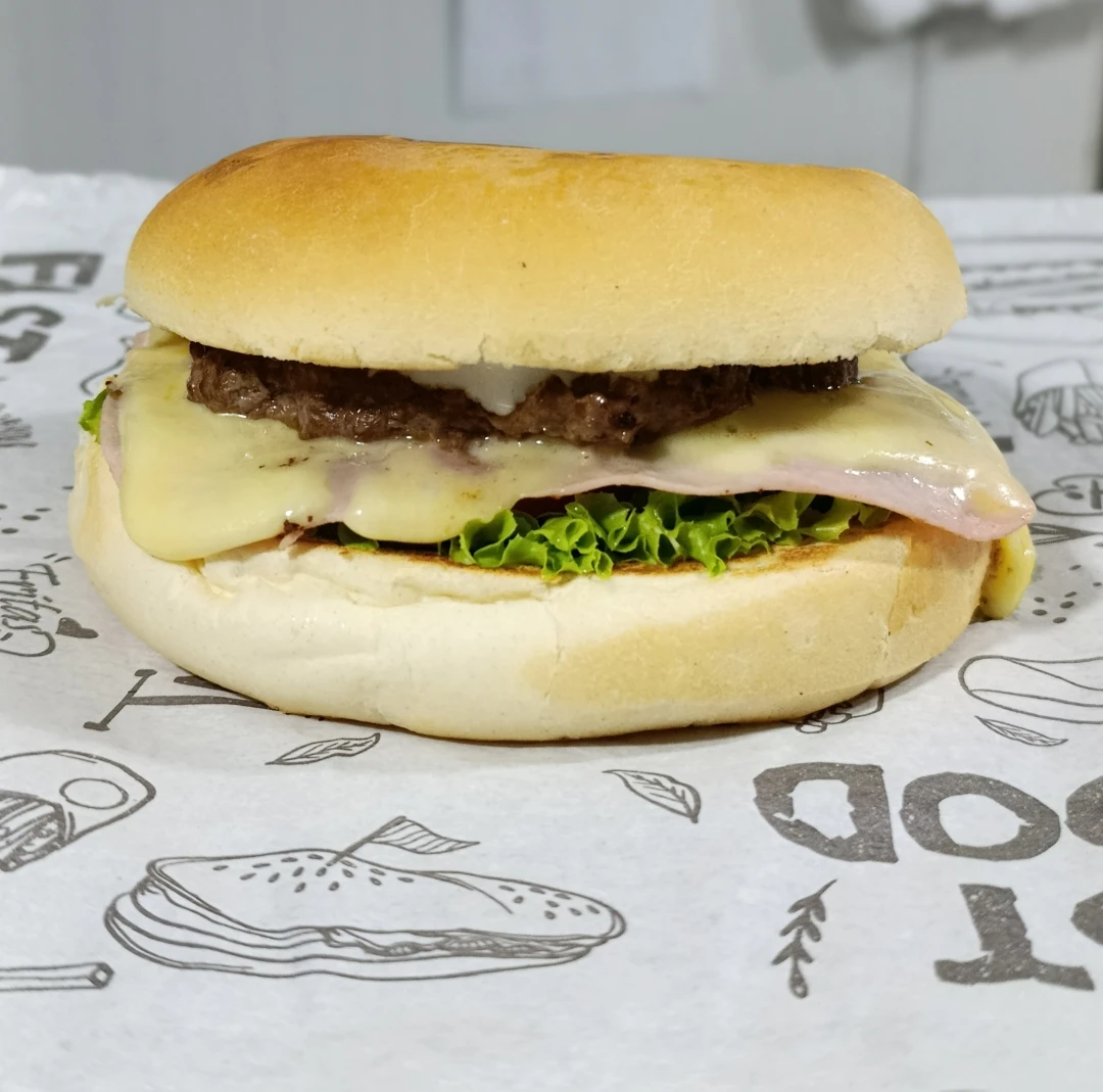 Pão, maionese, hambúrguer bovino de 100g, presunto, mussarela, alface e tomate.