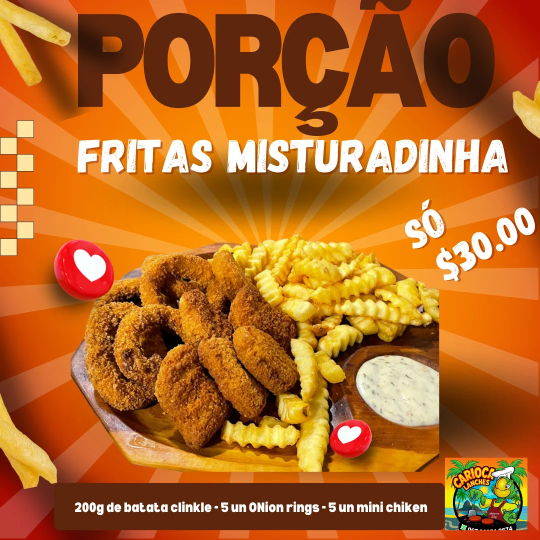 200g batata clinkle - 5 un ONion rings - 5 un mini chiken.